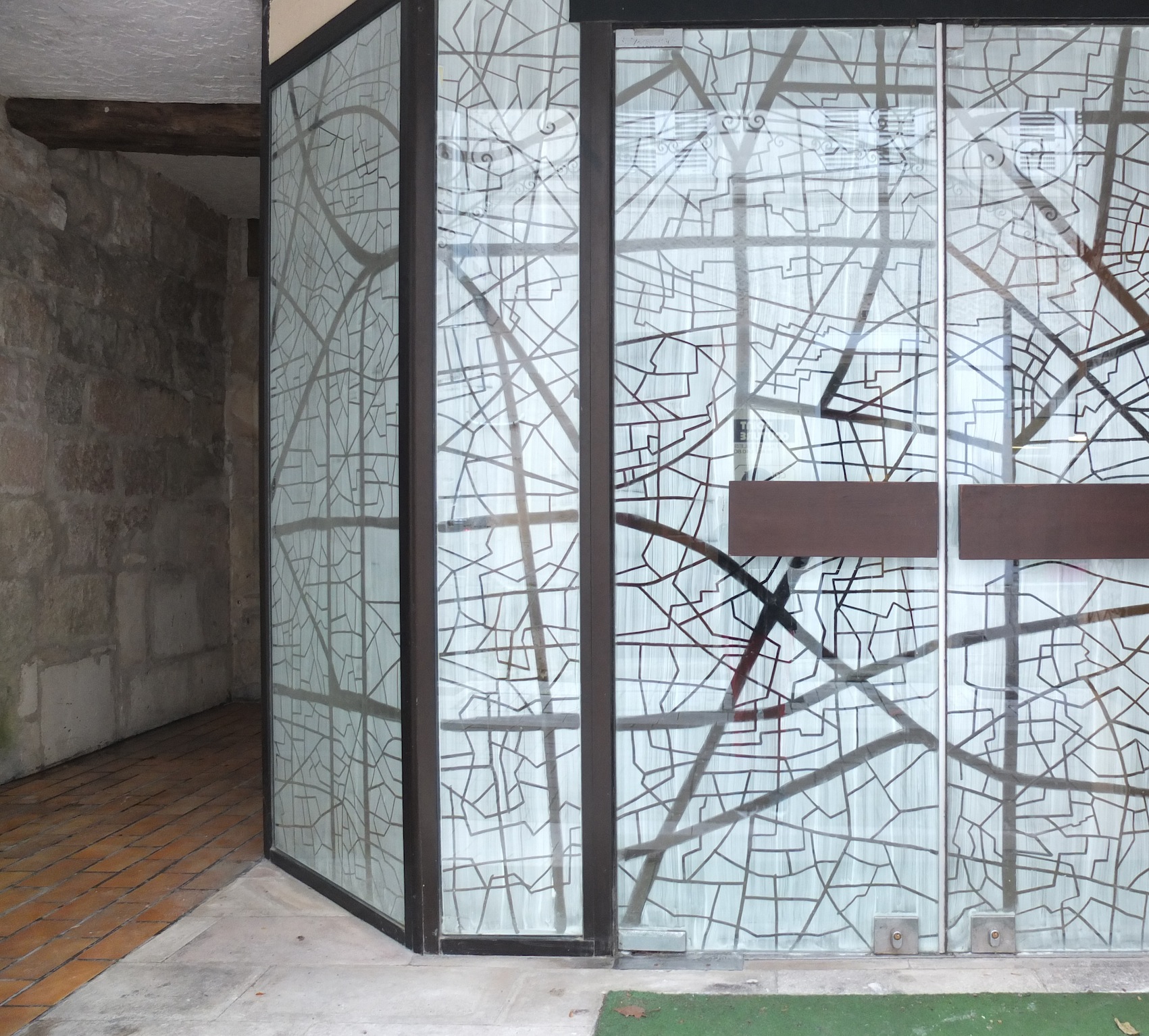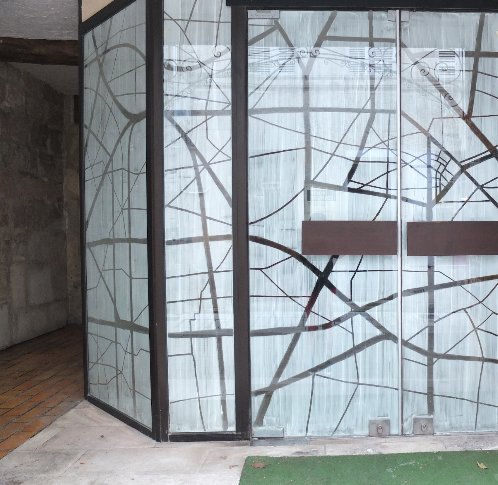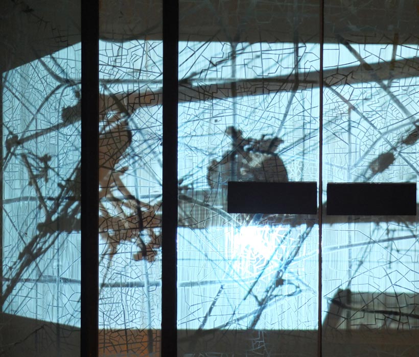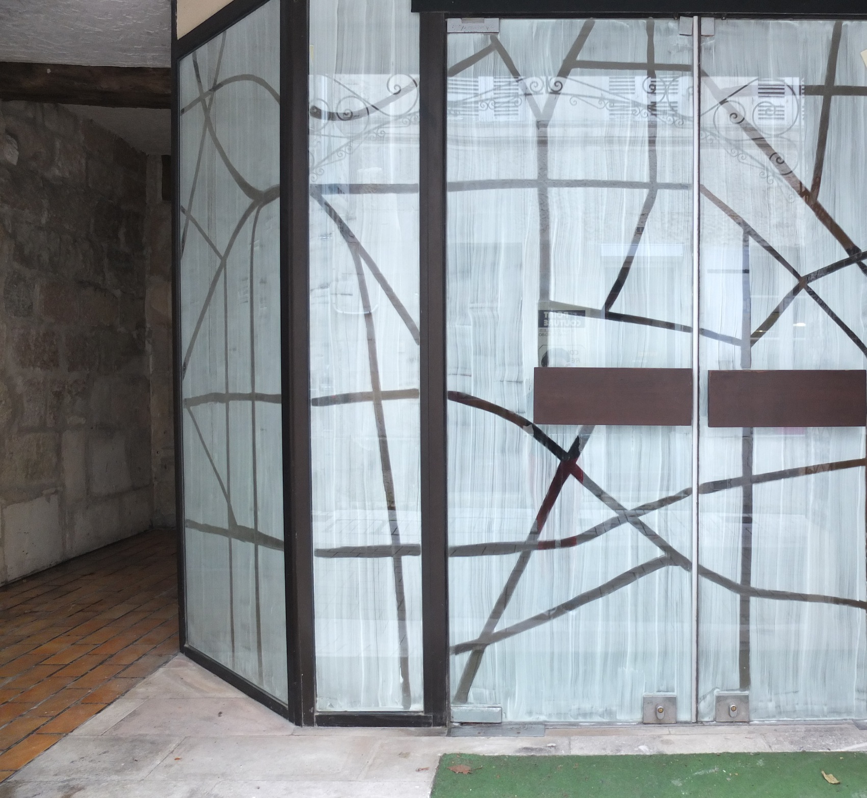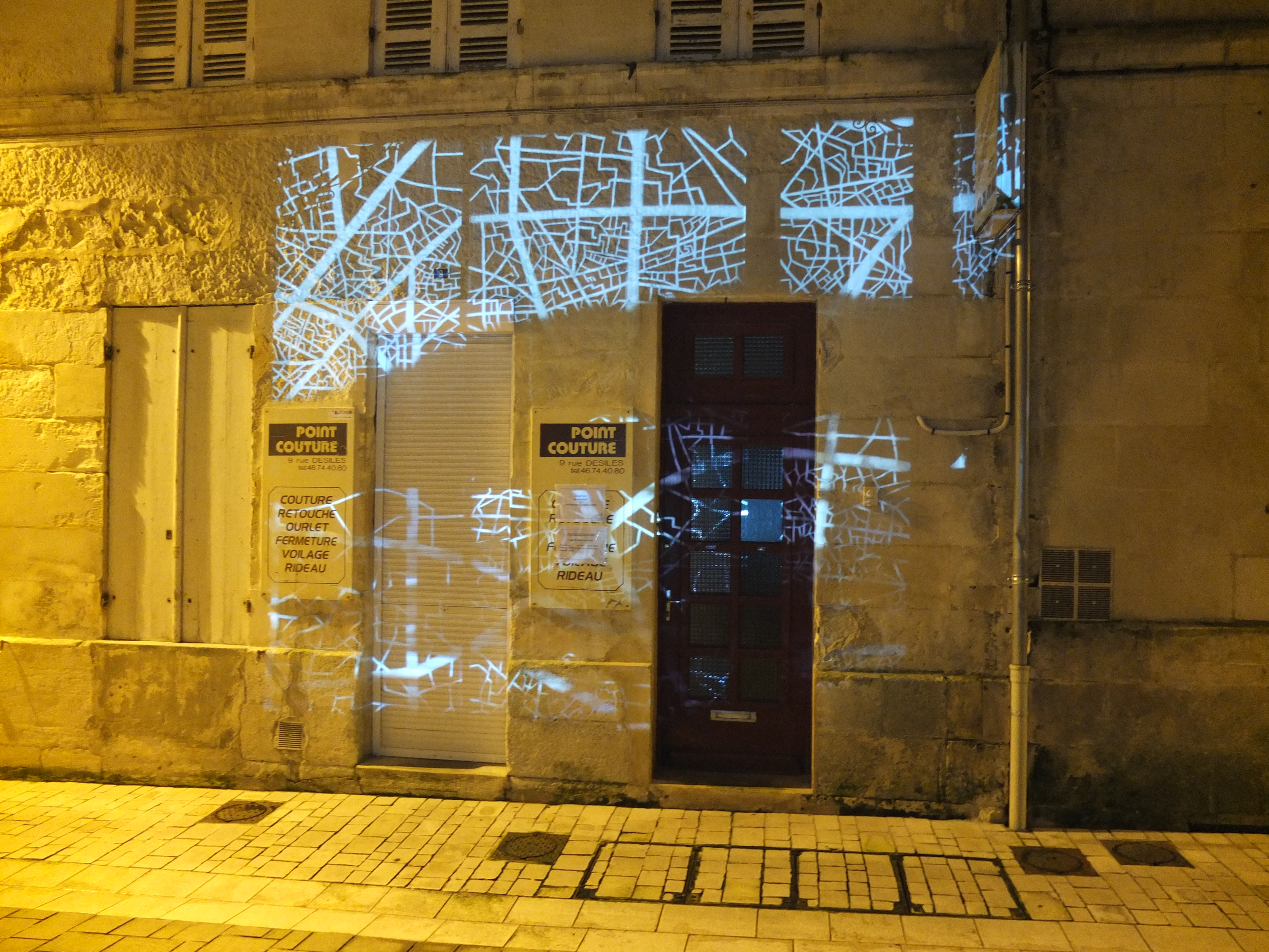 Cette installation a été réalisée sur la vitrine d’un magasin désaffecté. La surface vitrée a été transformée en un tableau noir en négatif.