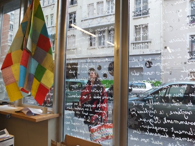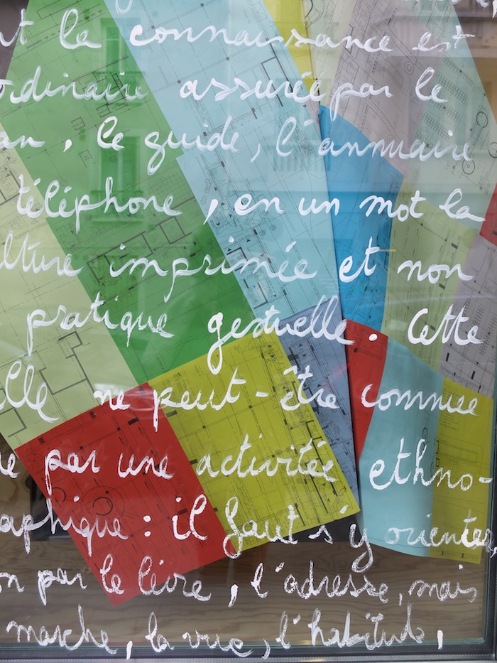 L’exposition s’est clôturée par une performance. Sur toute la hauteur de la vitrine, j’ai écrit le texte Sans adresses extrait du livre « L’empire des signes » de Roland Barthes. Il donne l’amorce de ma résidence à venir au Japon.