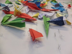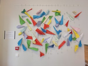 En parallèle à la création du vitrail, j’ai proposé une oeuvre participative. Le film d’animation Paperman en a été la source d’inspiration. Le détournement des outils de bureau, conçus pour être fonctionnels, se sont transformés en objets poétiques.