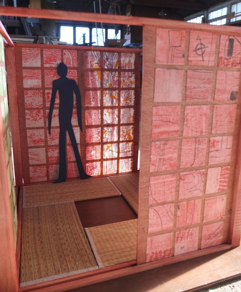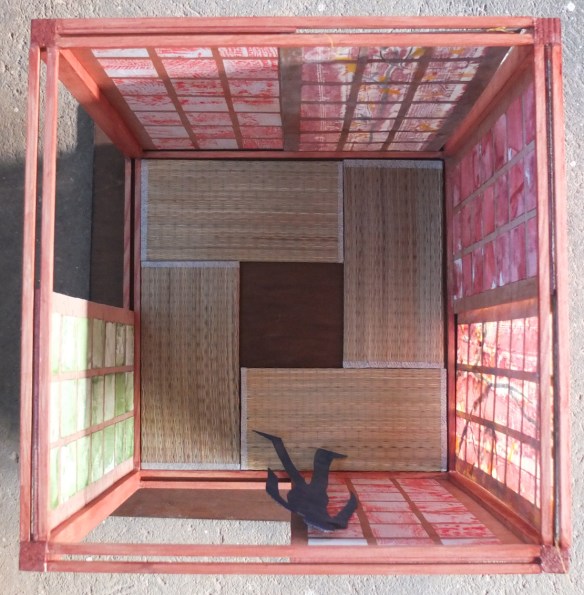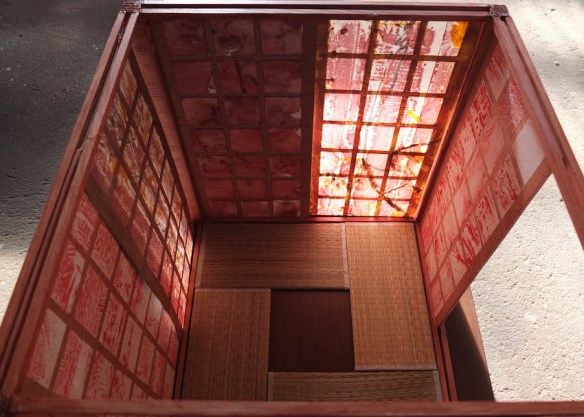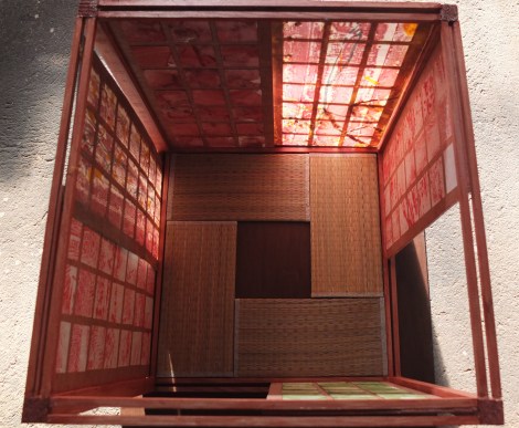 Le toit sera ôté à l’image des figurations japonaises de bâtiments : nommées fukinuki yatai, littéralement le toit ôté. Ce mode de représentation s’est développé à l’époque Heian (794-1185) dans les rouleaux peints des récits littéraires. La particularité de ce point de vue est d’estomper la séparation entre espace intérieur et extérieur, cela donnera à l’installation un souffle, une ouverture insolite.