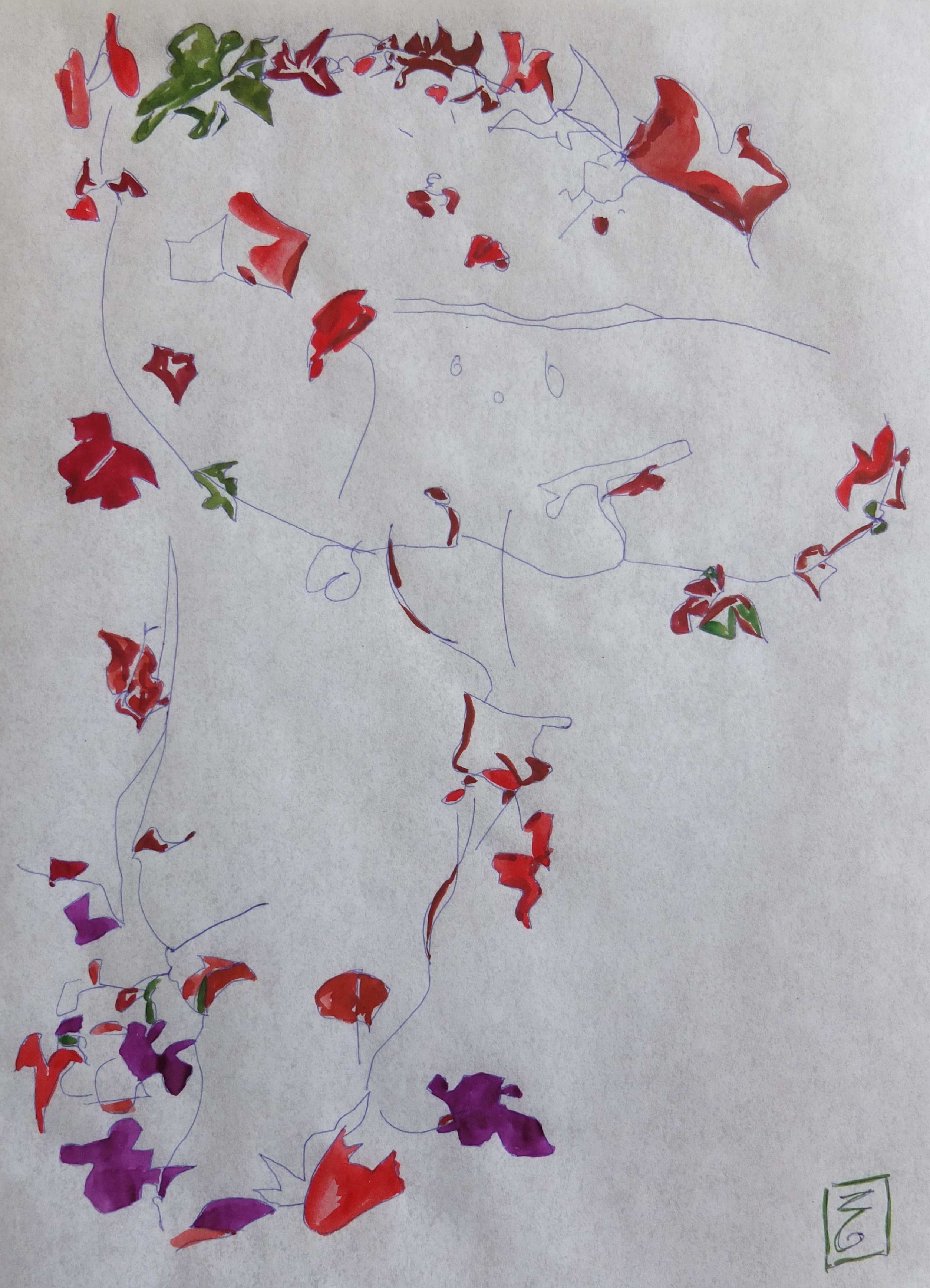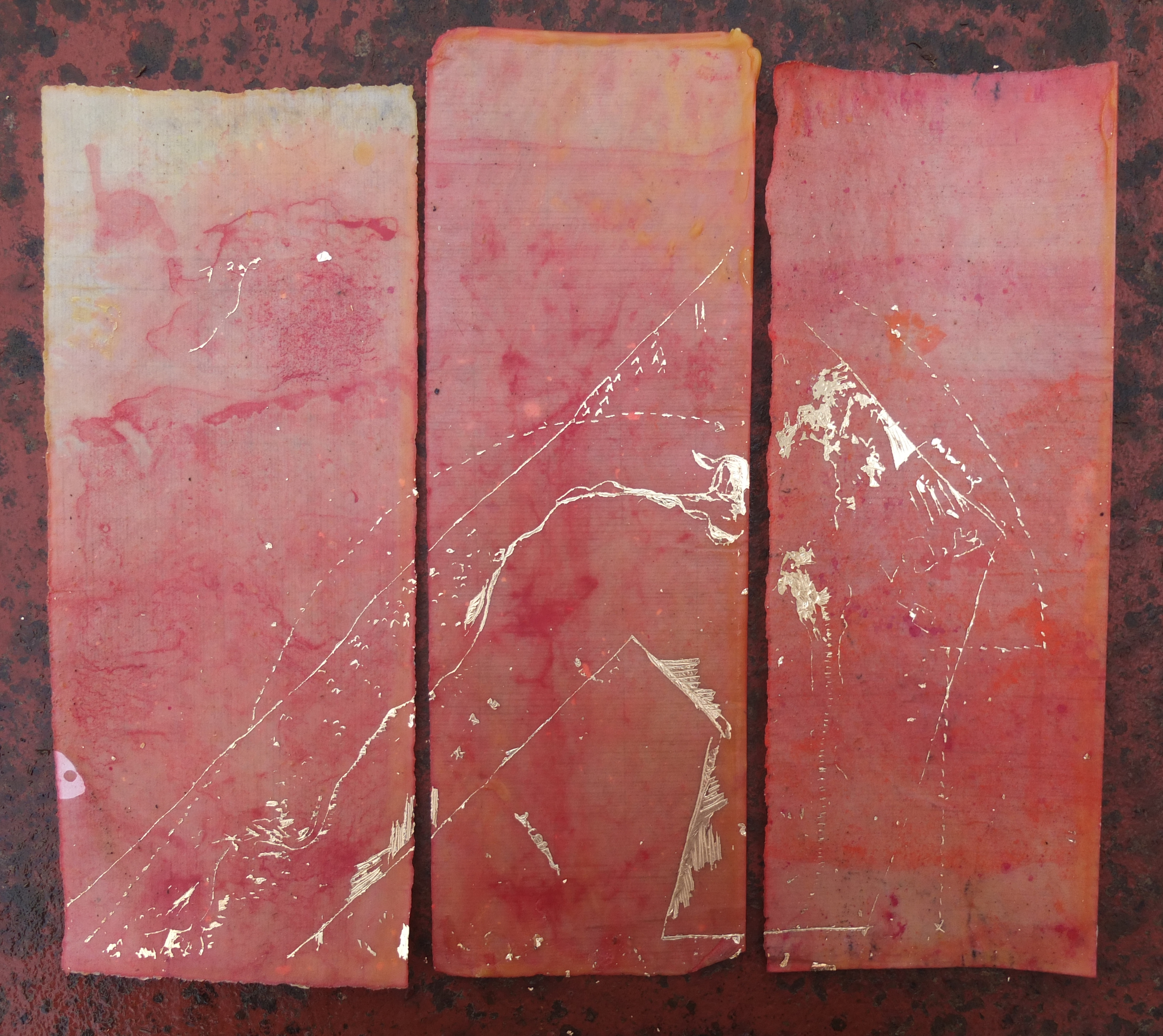 Les dessins que je crée dévoilent un enchevêtrement de lignes qui se superposent et s’accumulent tel un palimpseste. J’imprimerai des empreintes de coupe de bois sur la soie des shojis qui révèlera la trame de bois en utilisant la technique du monotype. Des cartes seront dessinées au-dessus de ces impressions.