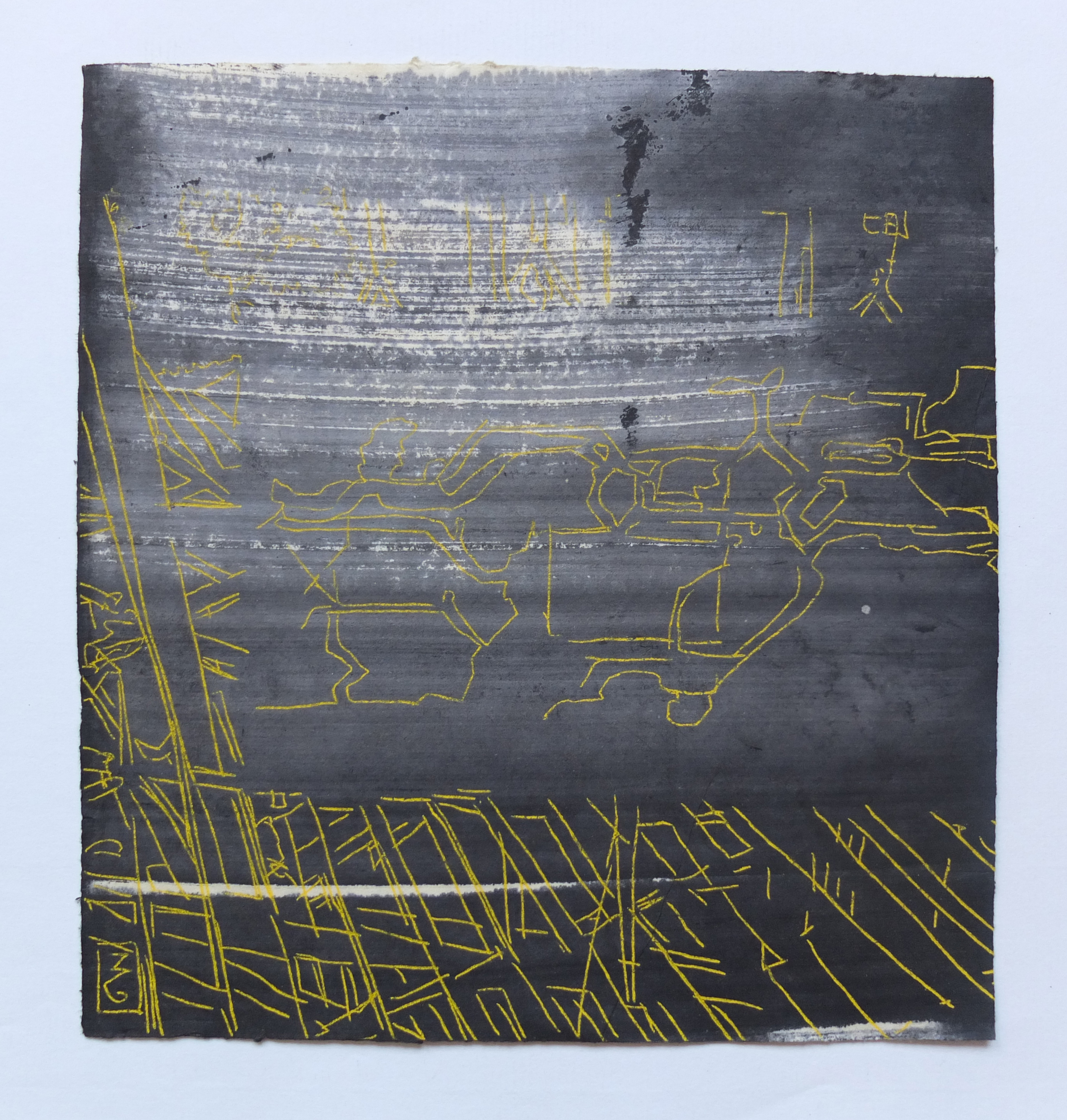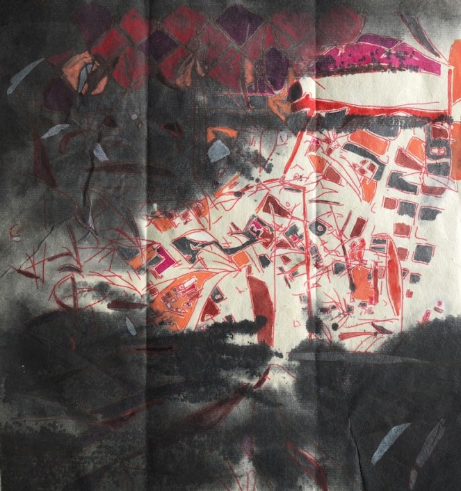 SofiA: Sensitive to the industrial wasteland, metalic overlap, I interprete the movement of the city, the town which appears and disappears, which constructs and destroys itself. During my strolls and my travels, I sketch, draw; taking pictures of the movement of the population, the machines’ vibrations, the decrepit walls cracked like urban scars. A repertory of images is created by this experience, which will act as raw materiel for my pictorial compositions.