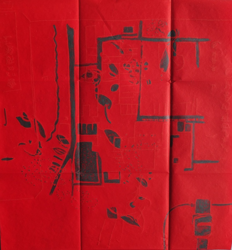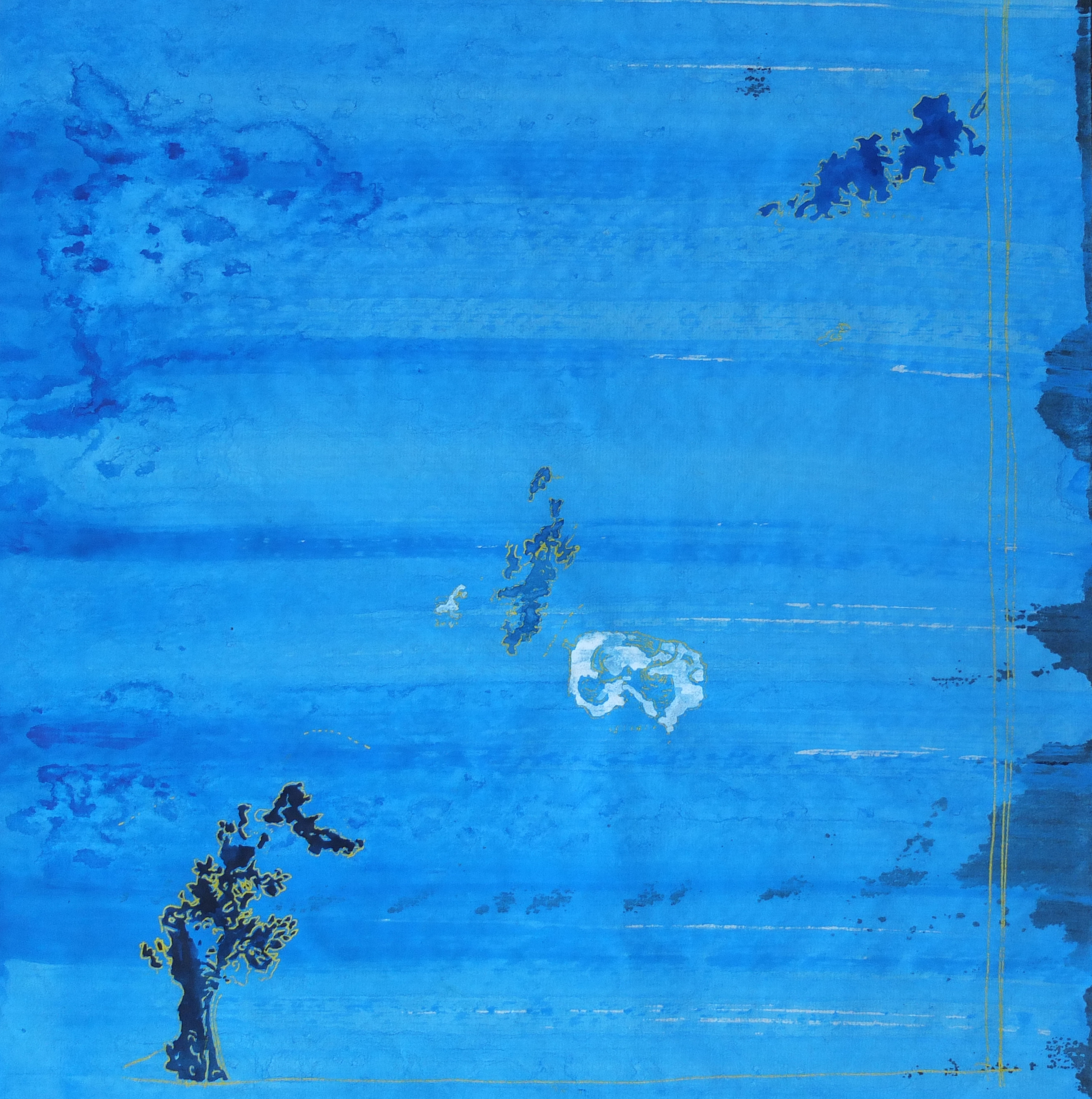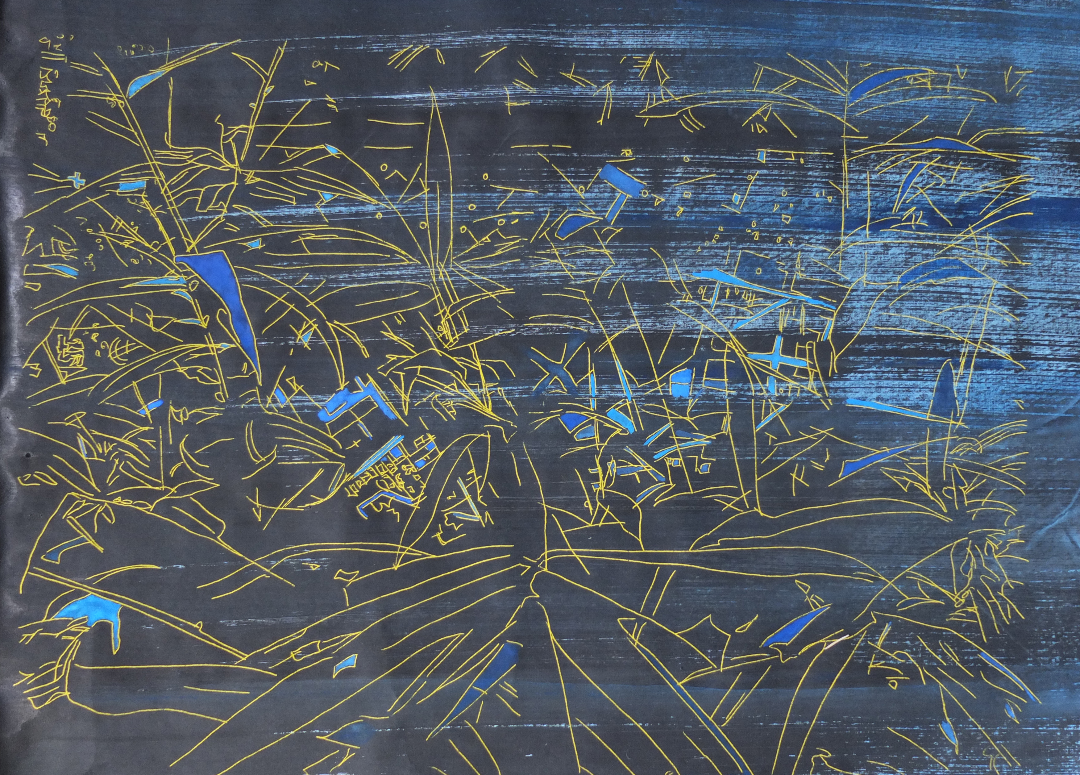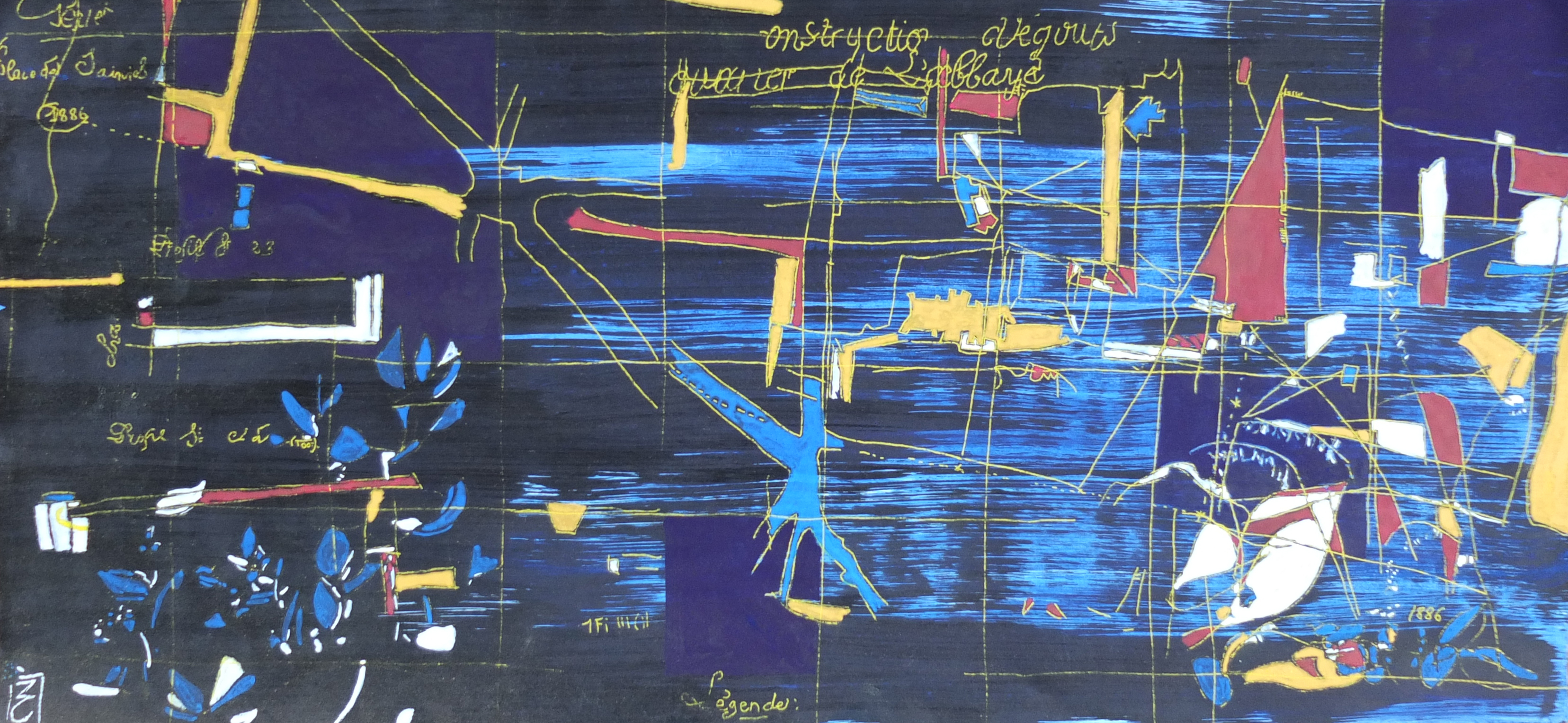 The graphic framework, almost unreal, is rendered dynamic by a vibrant and luminous palette. The colour balances this profusion of lines, each bringing its own impression of depth. The ensemble gives birth to palimpsests of line and colour.