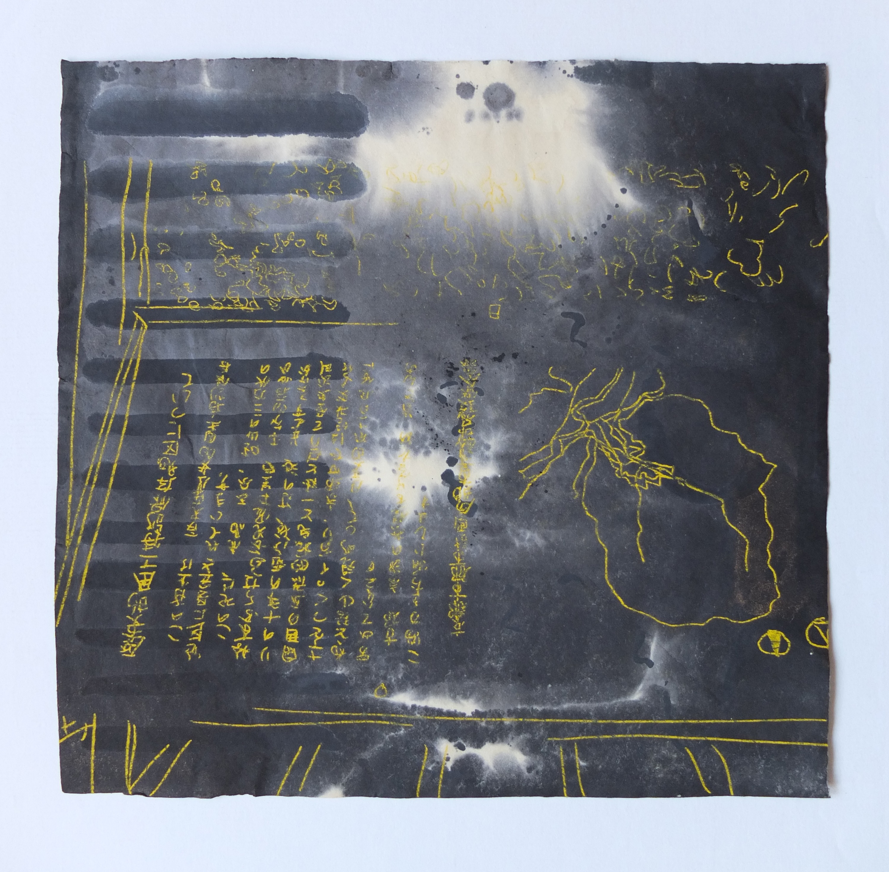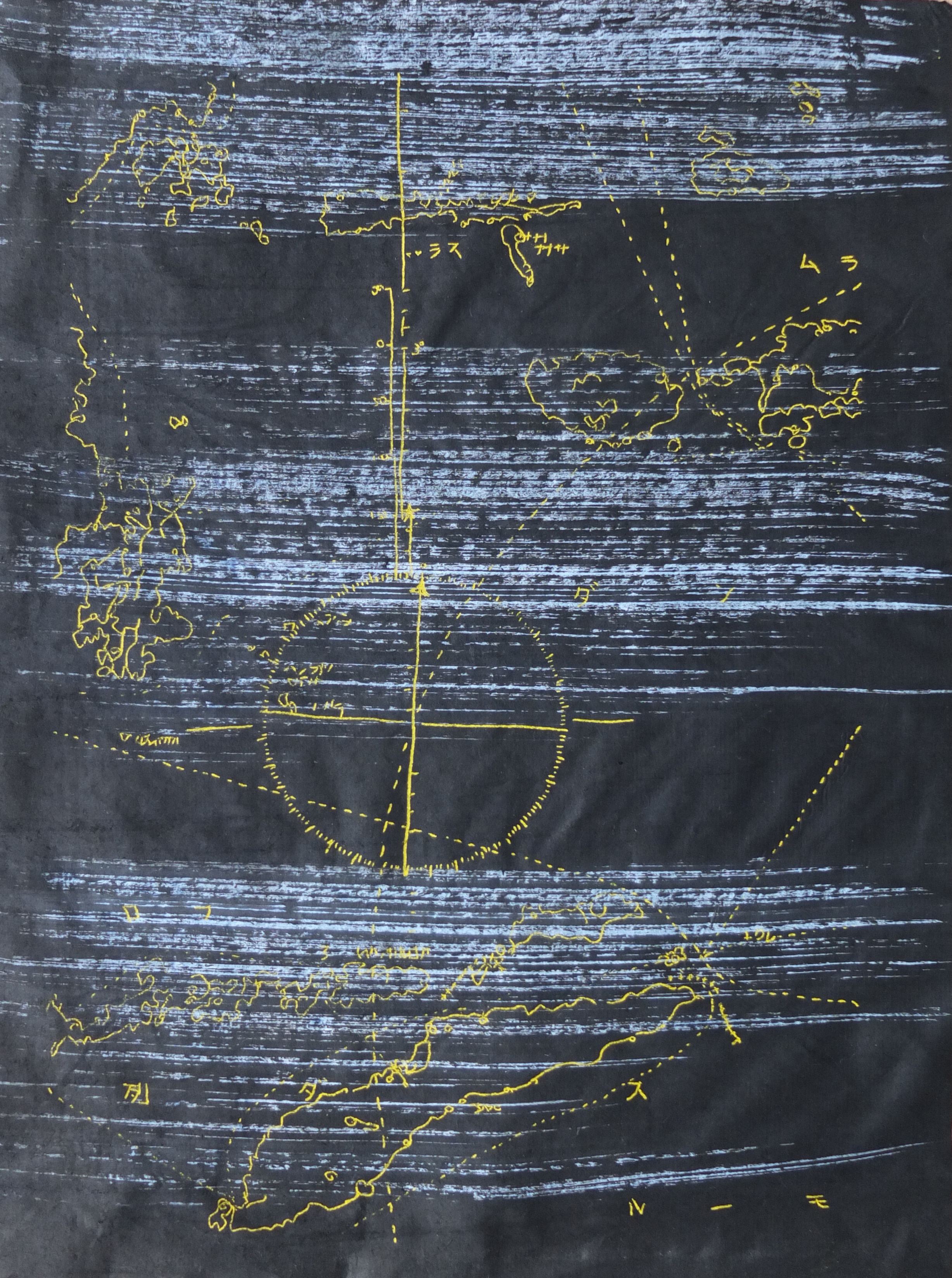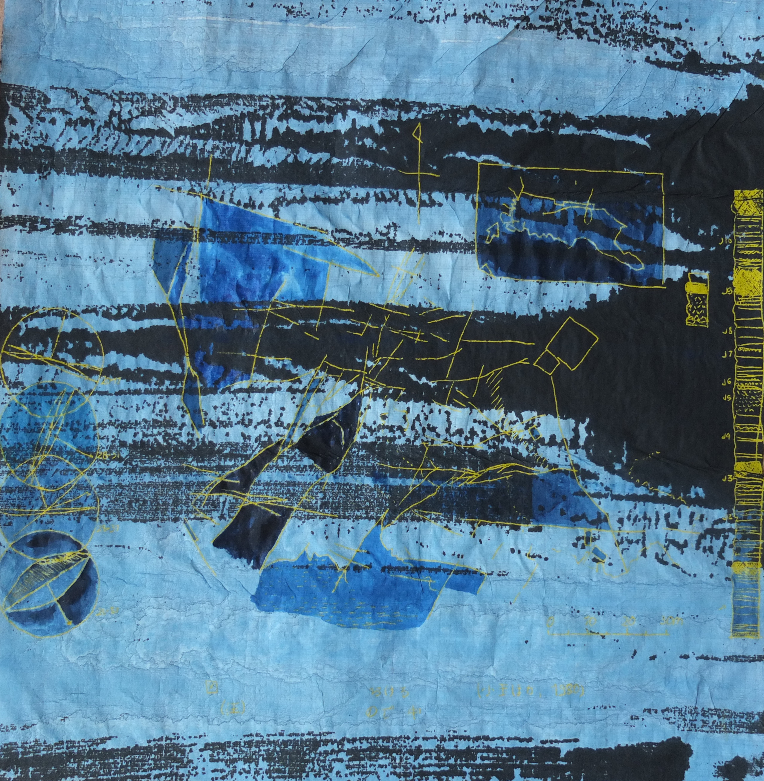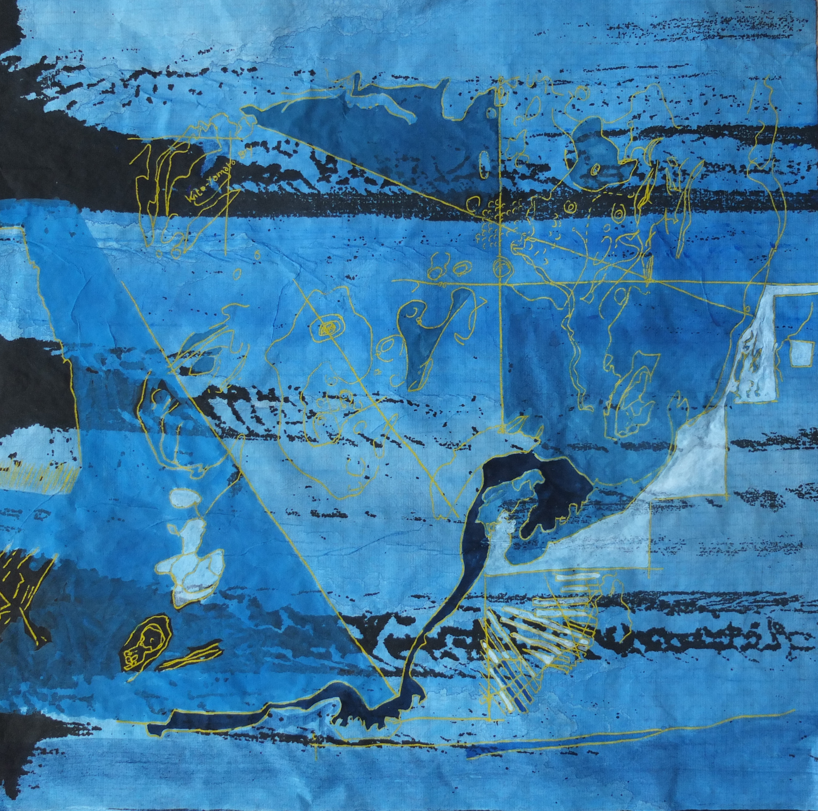 The graphic framework, almost unreal, is rendered dynamic by a vibrant and luminous palette. The colour balances this profusion of lines, each bringing its own impression of depth. The ensemble gives birth to palimpsests of line and colour.