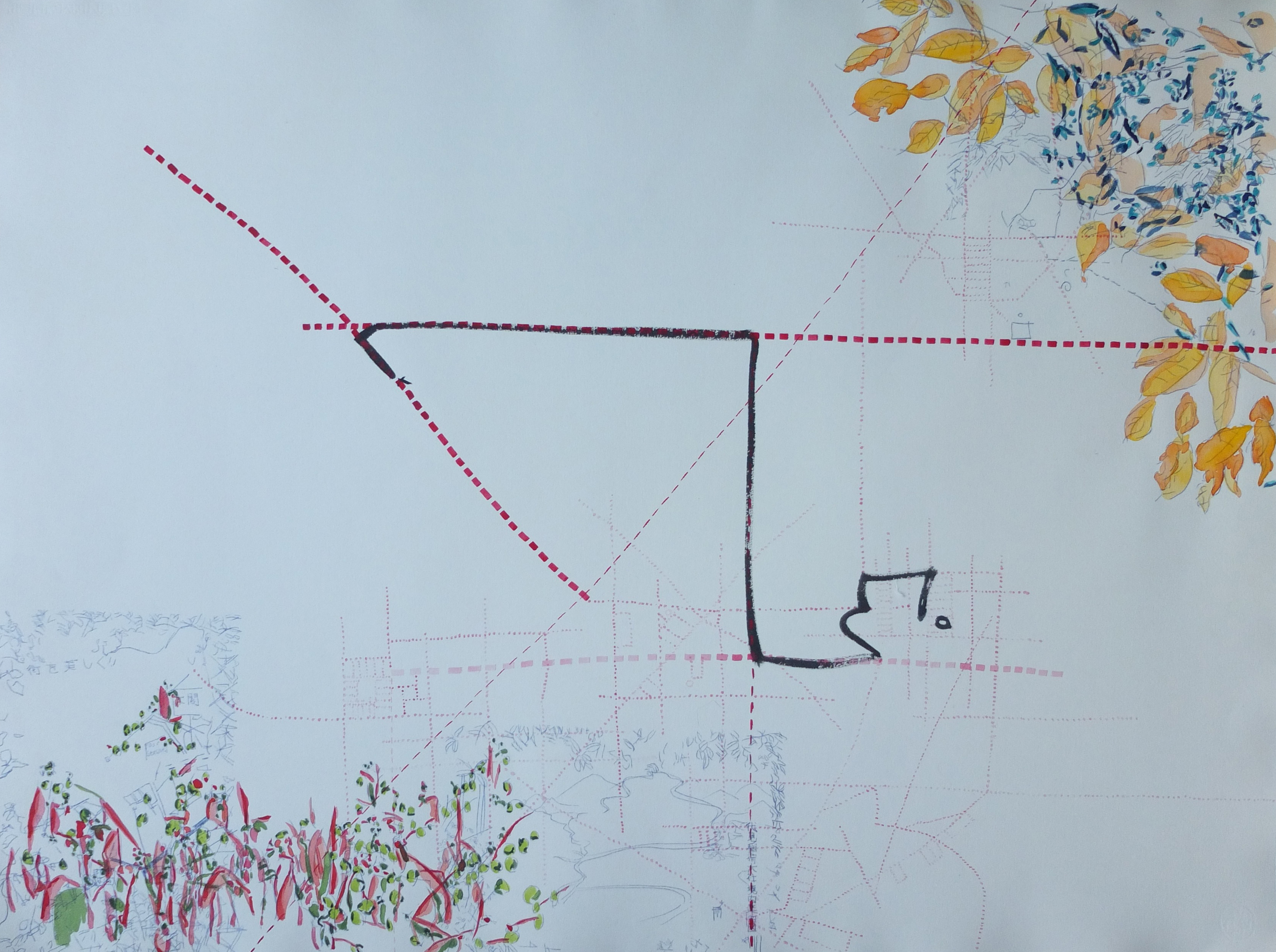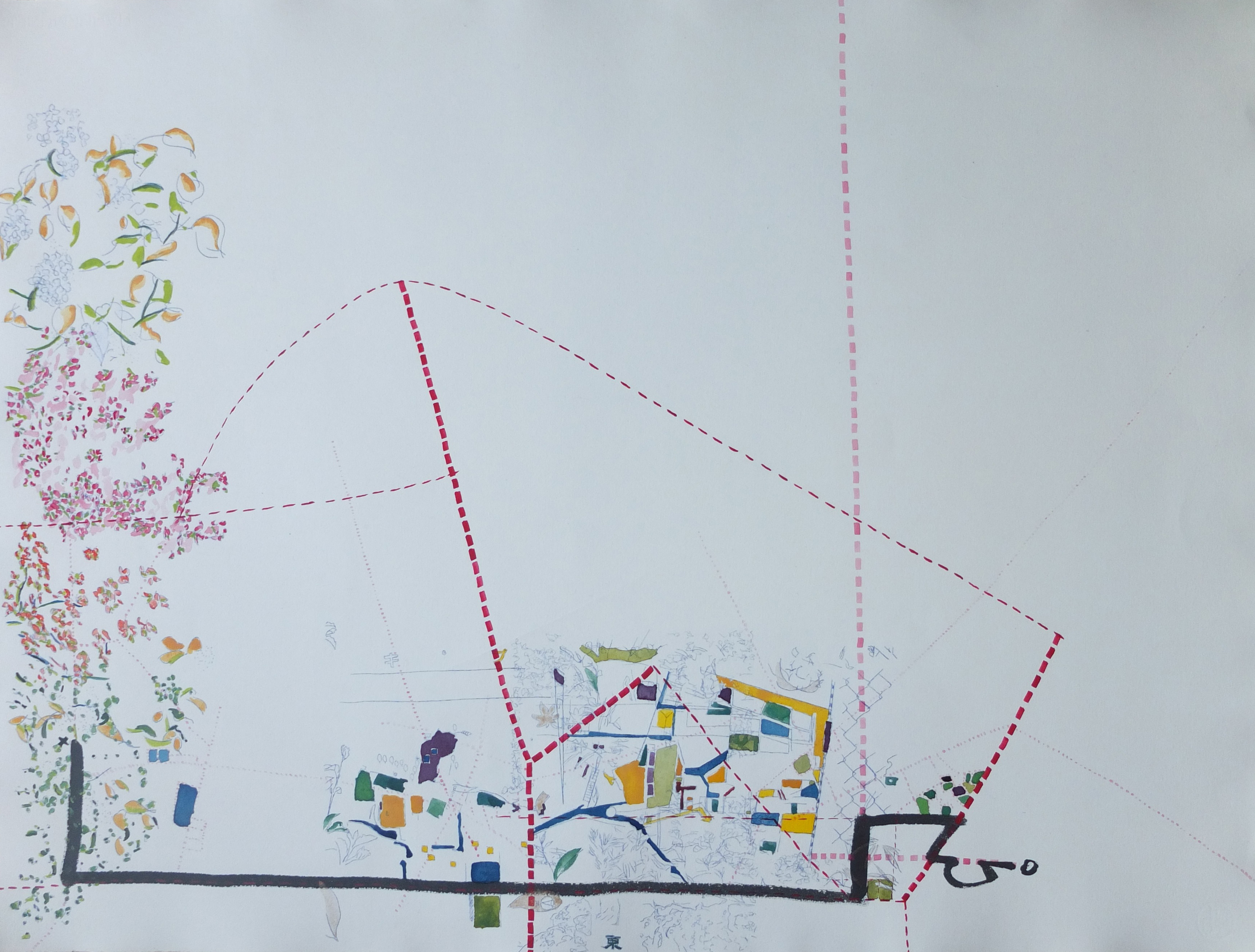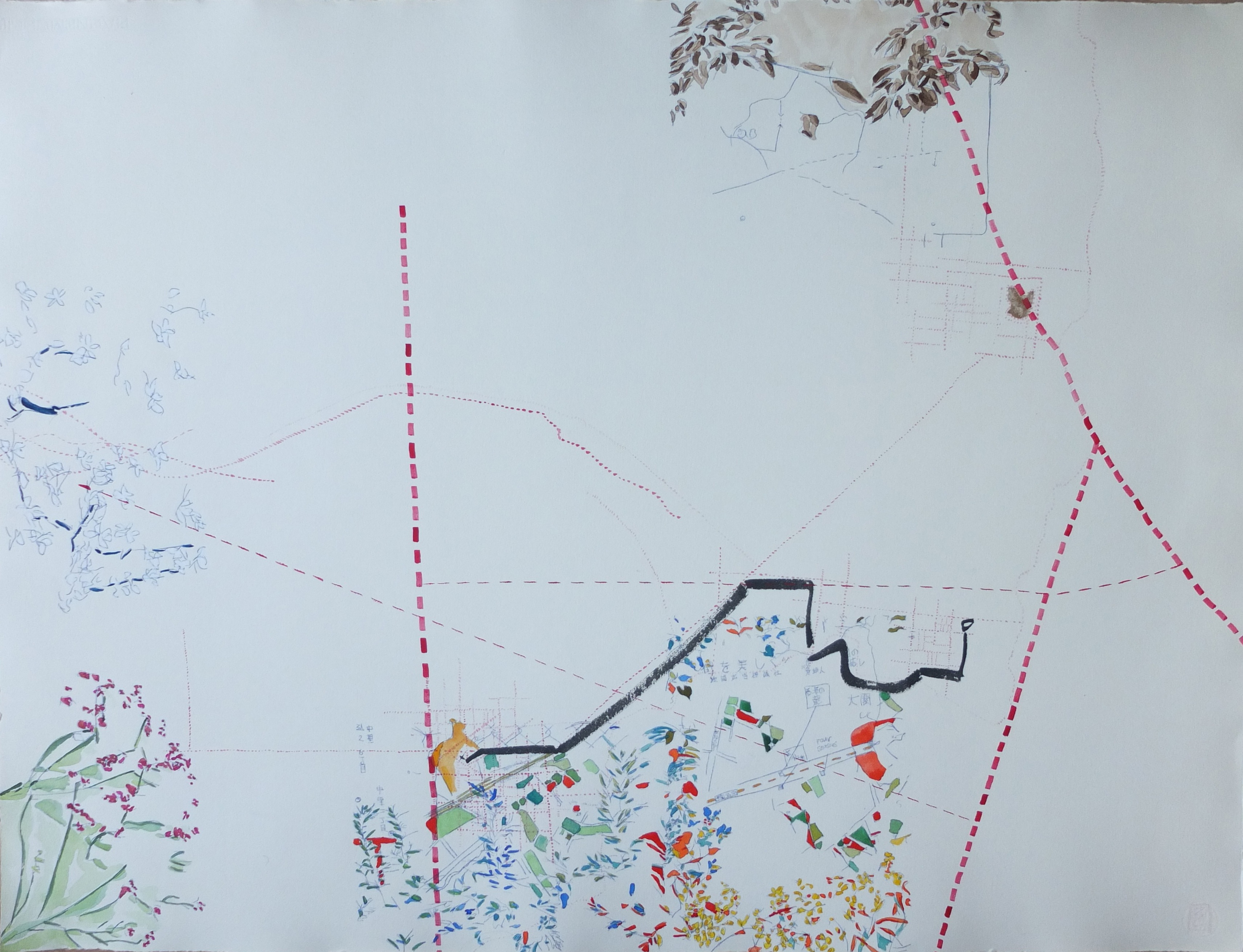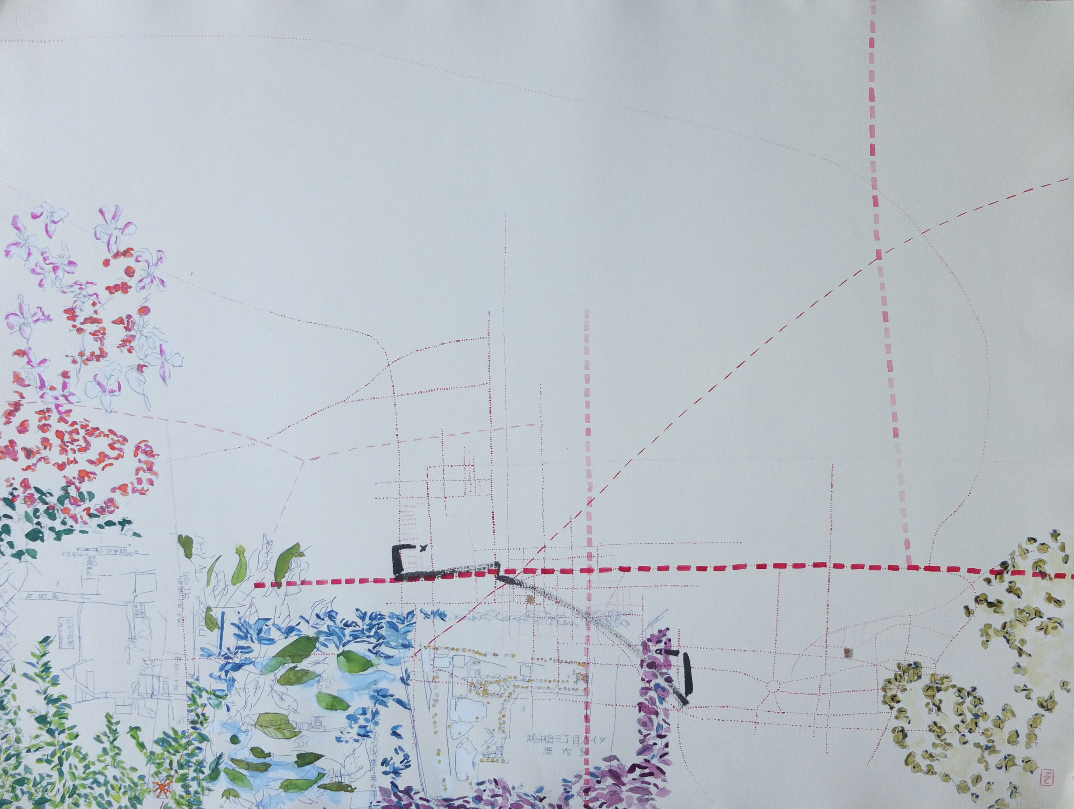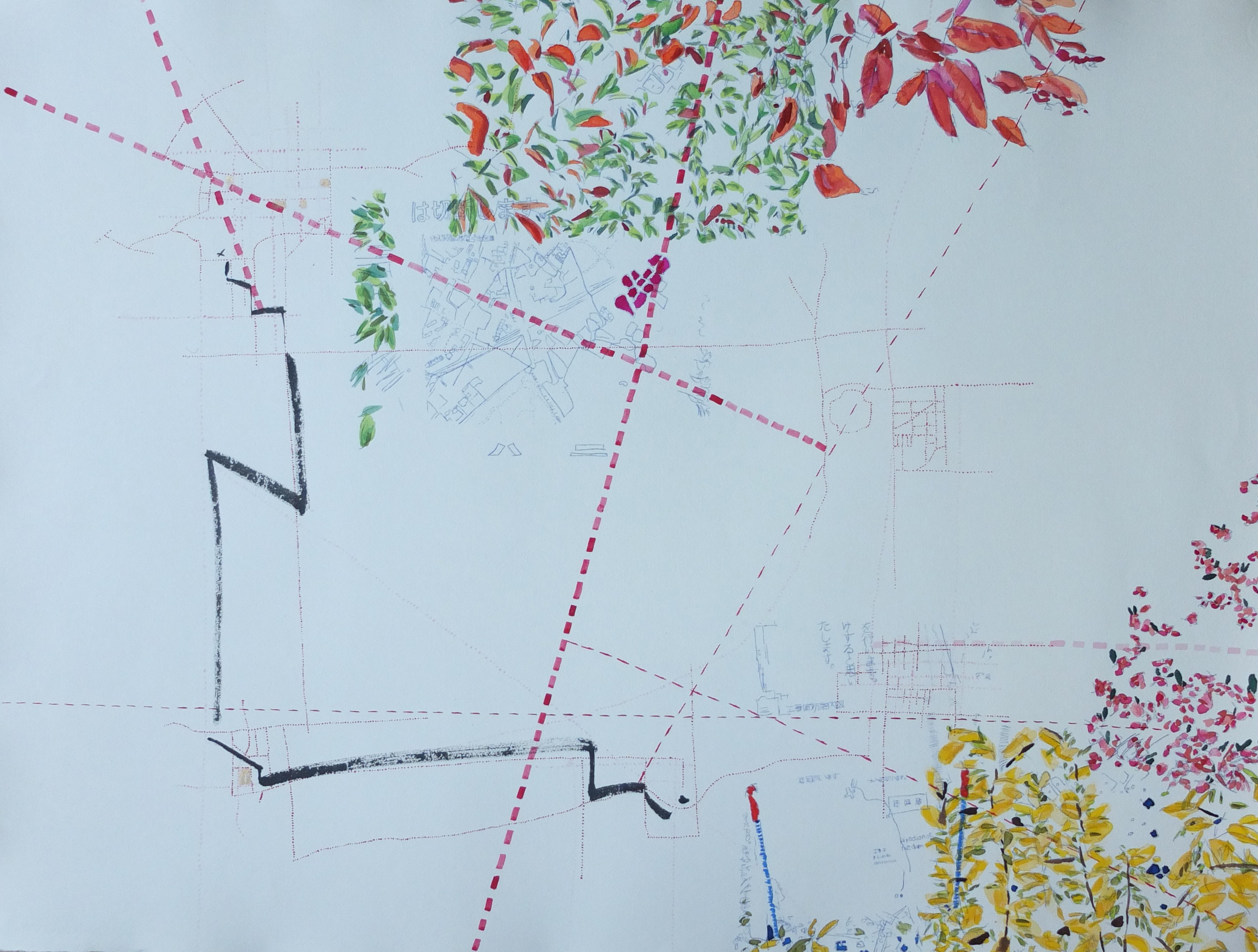 La trame graphique, presque irréelle, est dynamisée par une palette vibrante et lumineuse. La couleur est un moyen qui rééquilibre cette profusion de lignes apportant des effets de profondeur et des ajustements de volume. L’ensemble donne naissance à des palimpsestes de lignes et de couleurs.