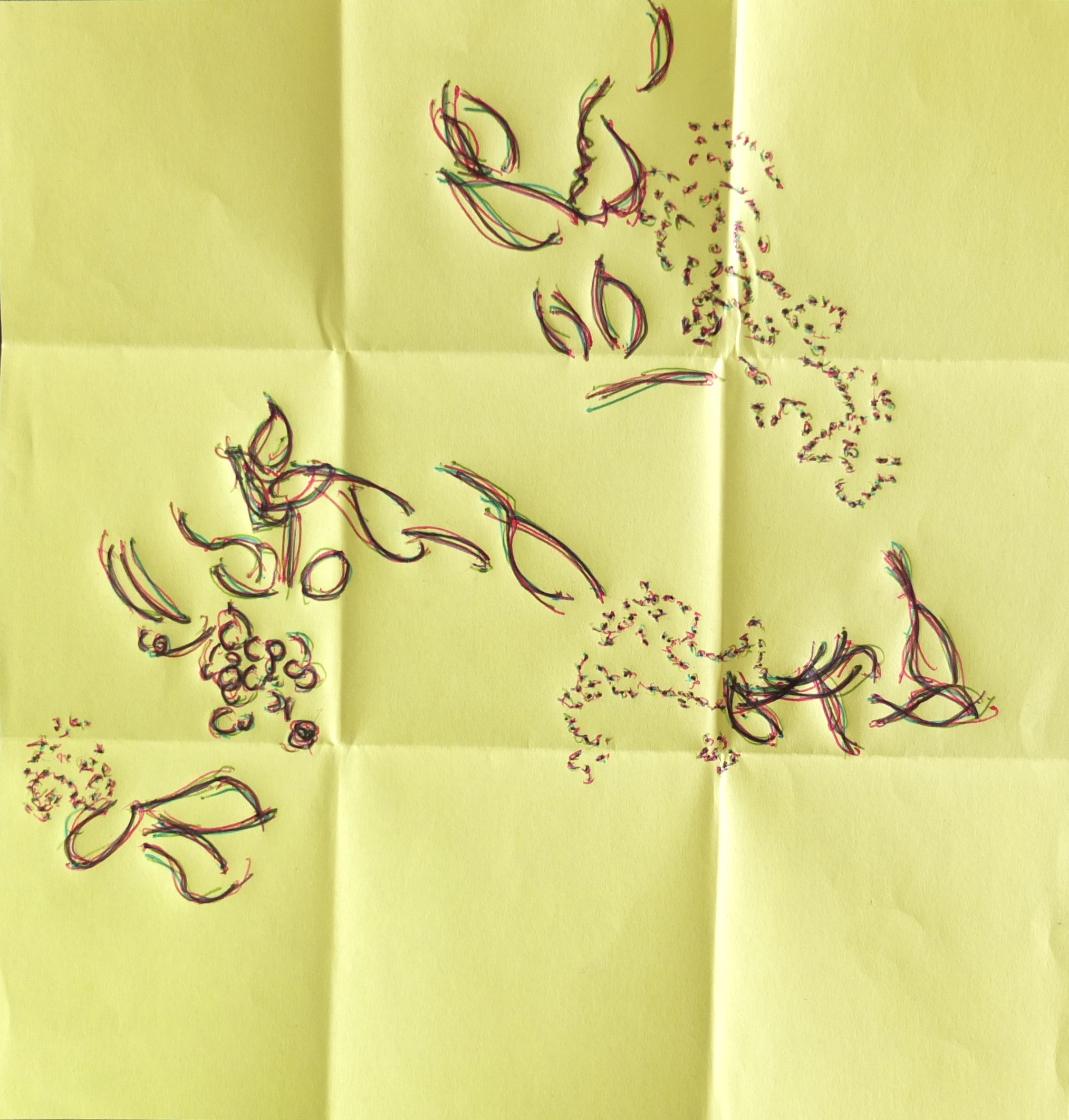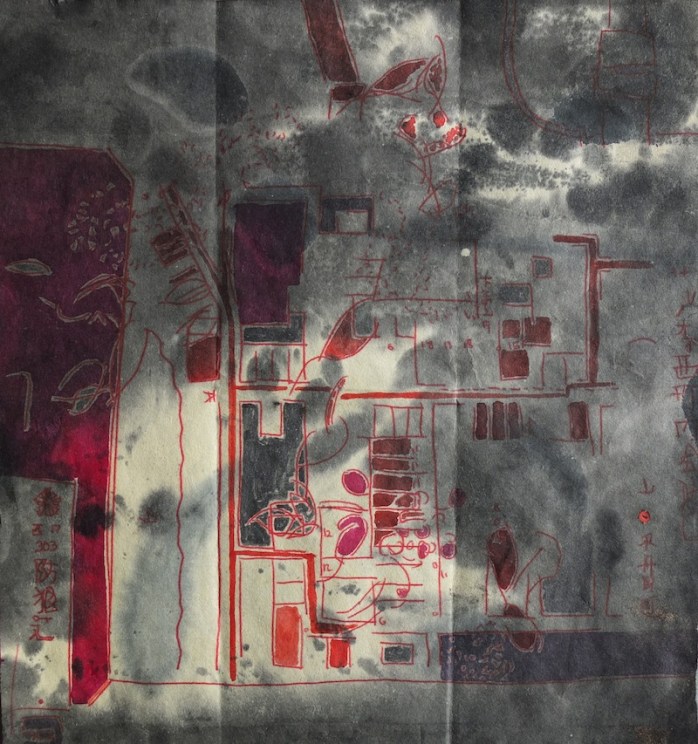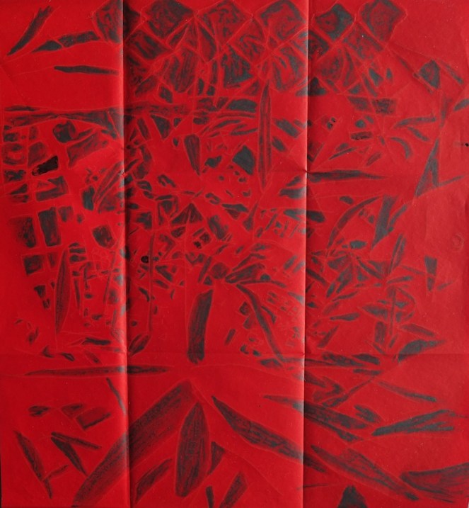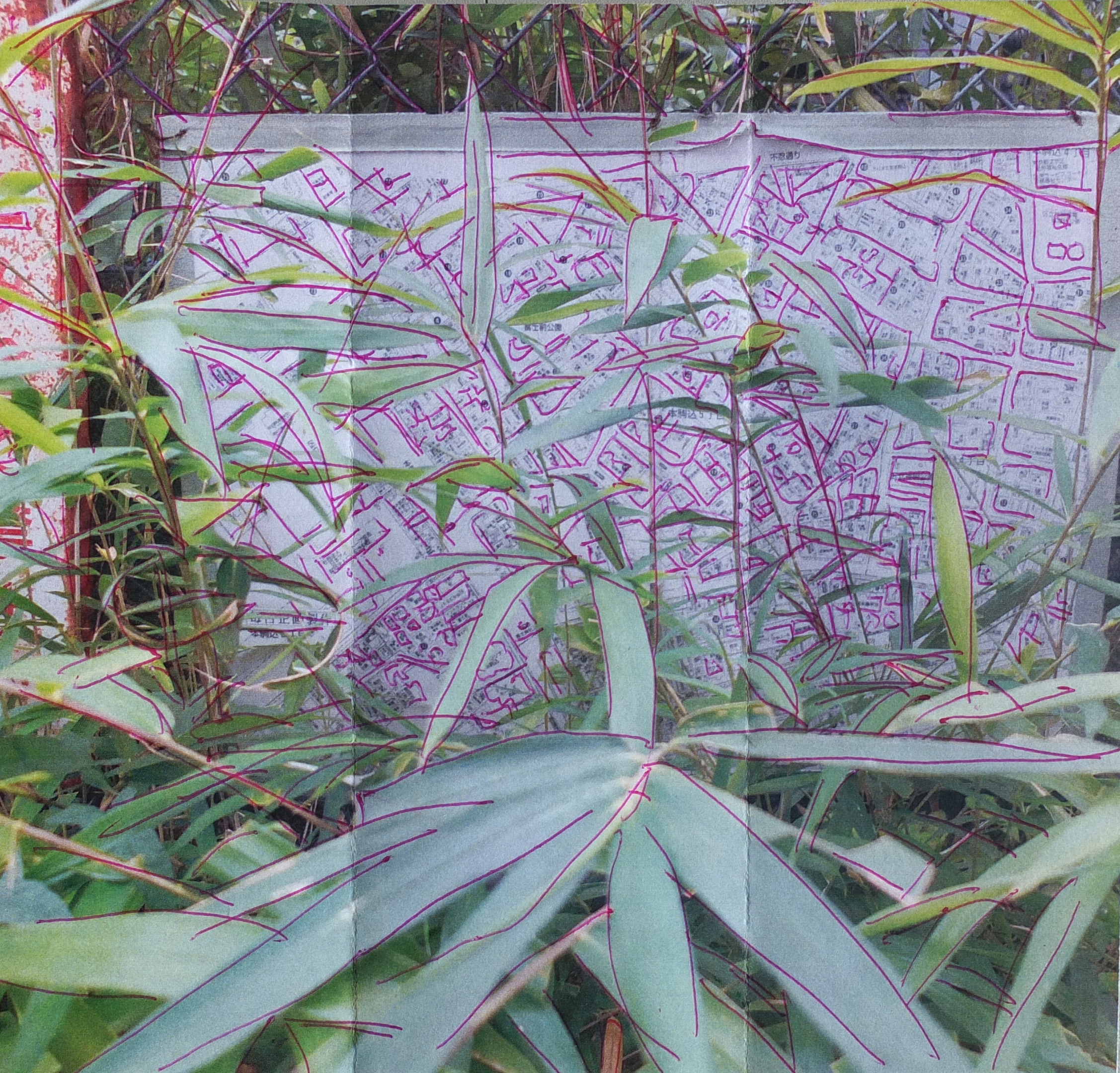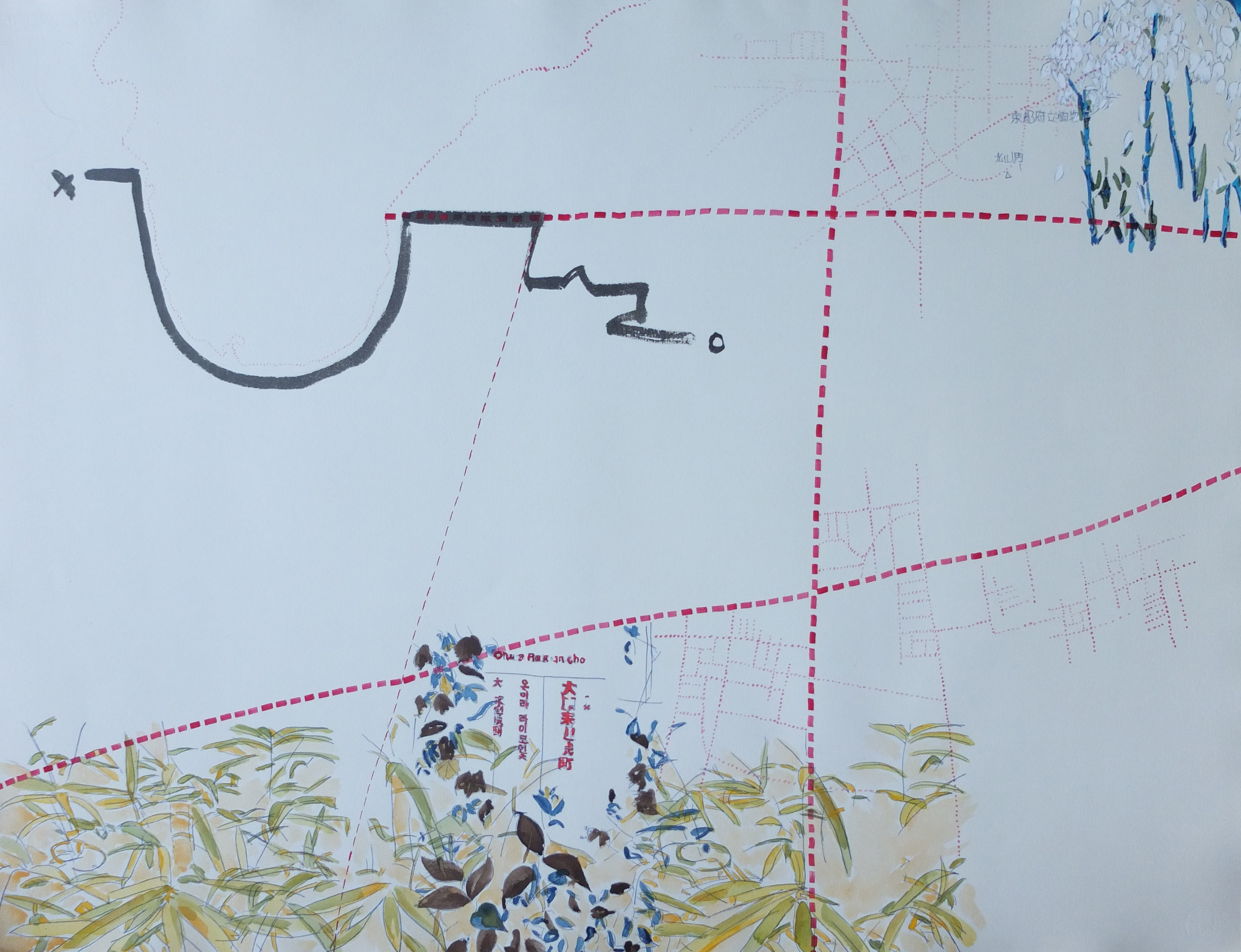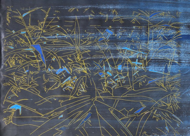 La trame graphique, presque irréelle, est dynamisée par une palette vibrante et lumineuse. La couleur est un moyen qui rééquilibre cette profusion de lignes apportant des effets de profondeur et des ajustements de volume. L’ensemble donne naissance à des palimpsestes de lignes et de couleurs.