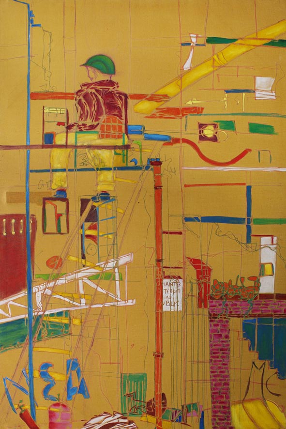 SofiA: Sensitive to the industrial wasteland, metalic overlap, I interprete the movement of the city, the town which appears and disappears, which constructs and destroys itself. During my strolls and my travels, I sketch, draw; taking pictures of the movement of the population, the machines’ vibrations, the decrepit walls cracked like urban scars. A repertory of images is created by this experience, which will act as raw materiel for my pictorial compositions.